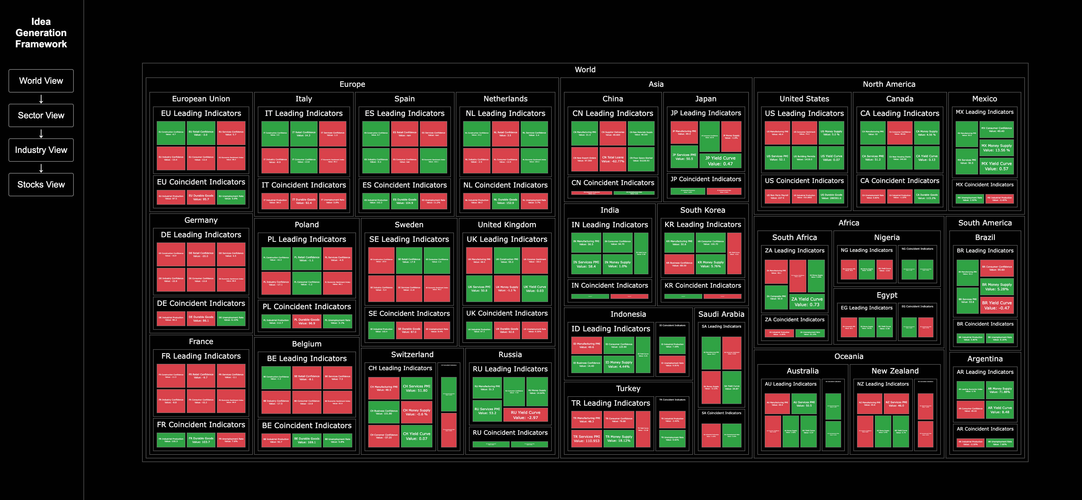 This step is crucial in our Trade Idea Generation Process, as these indicators guide our economic outlook for specific countries or regions.For example, if most indicators for the United States are bullish, our stock market outlook becomes bullish, prompting us to identify the top-performing sectors.